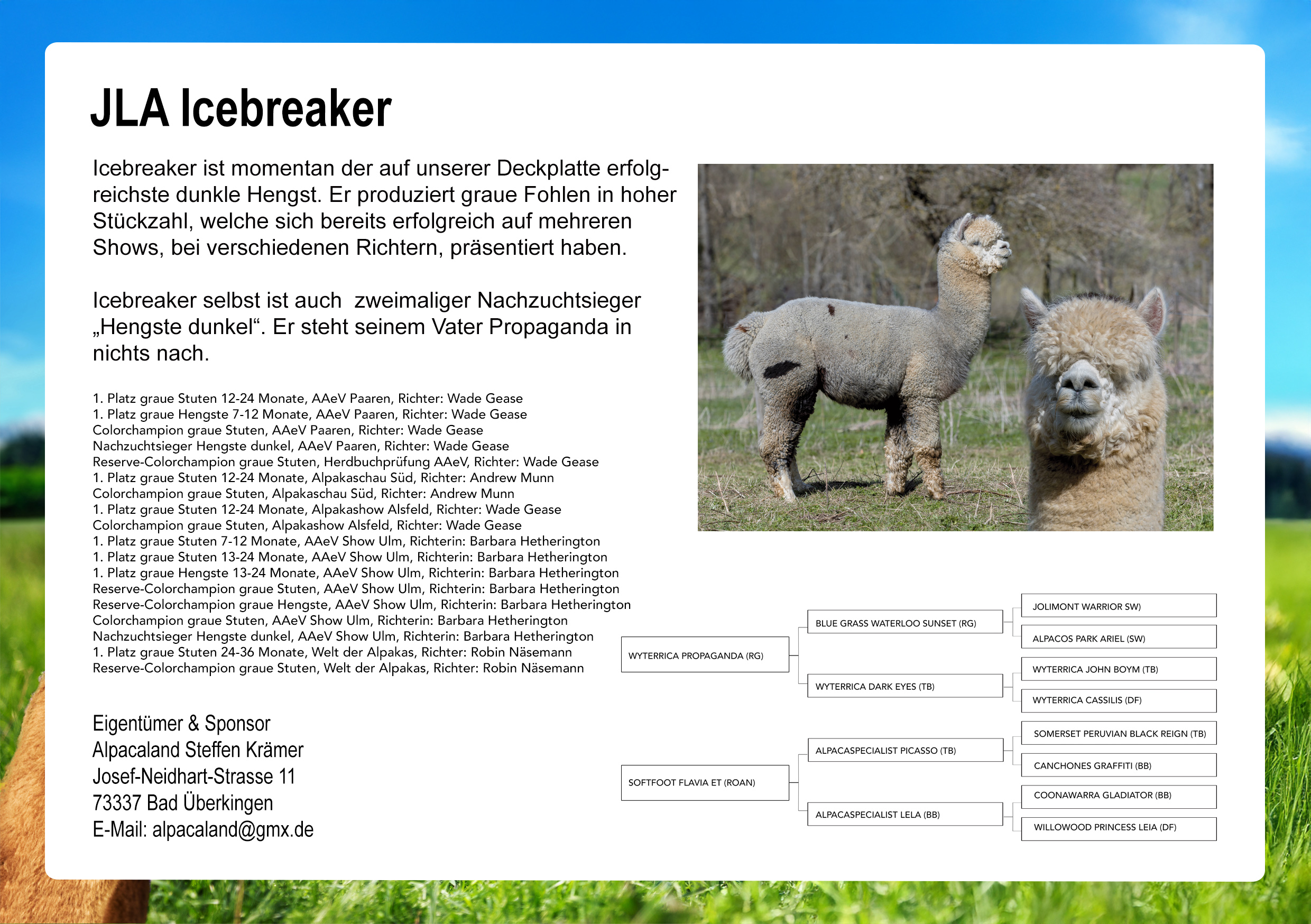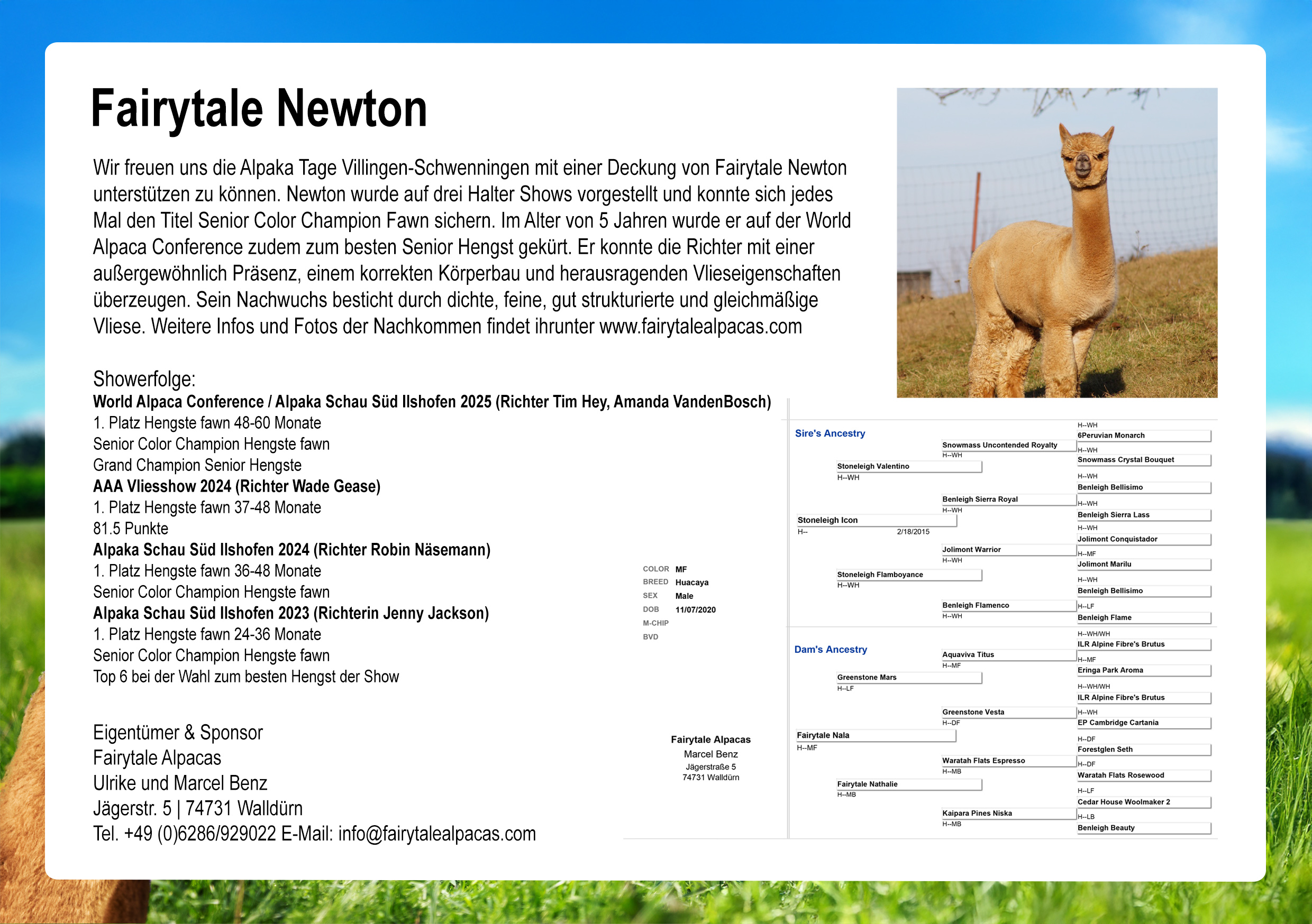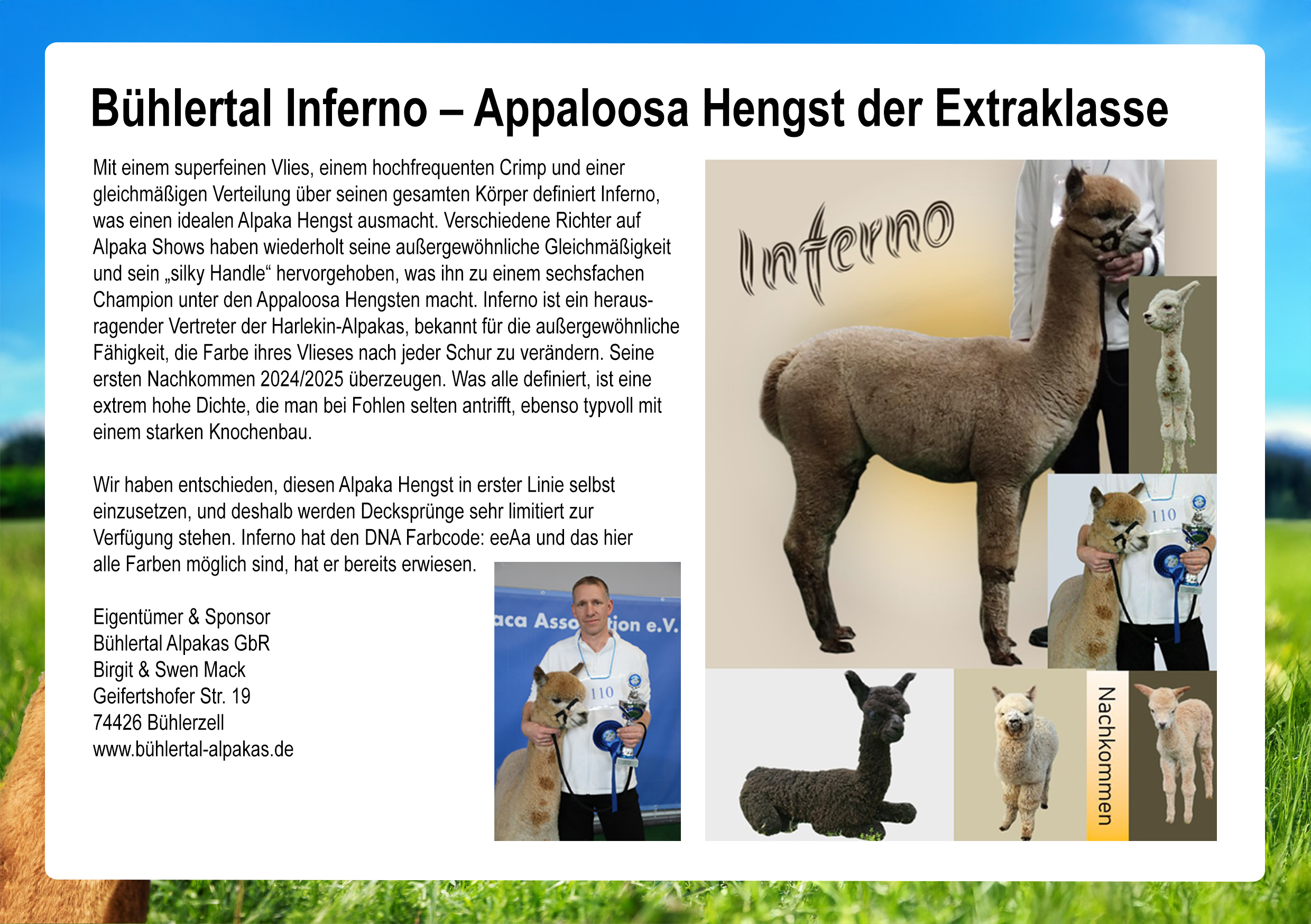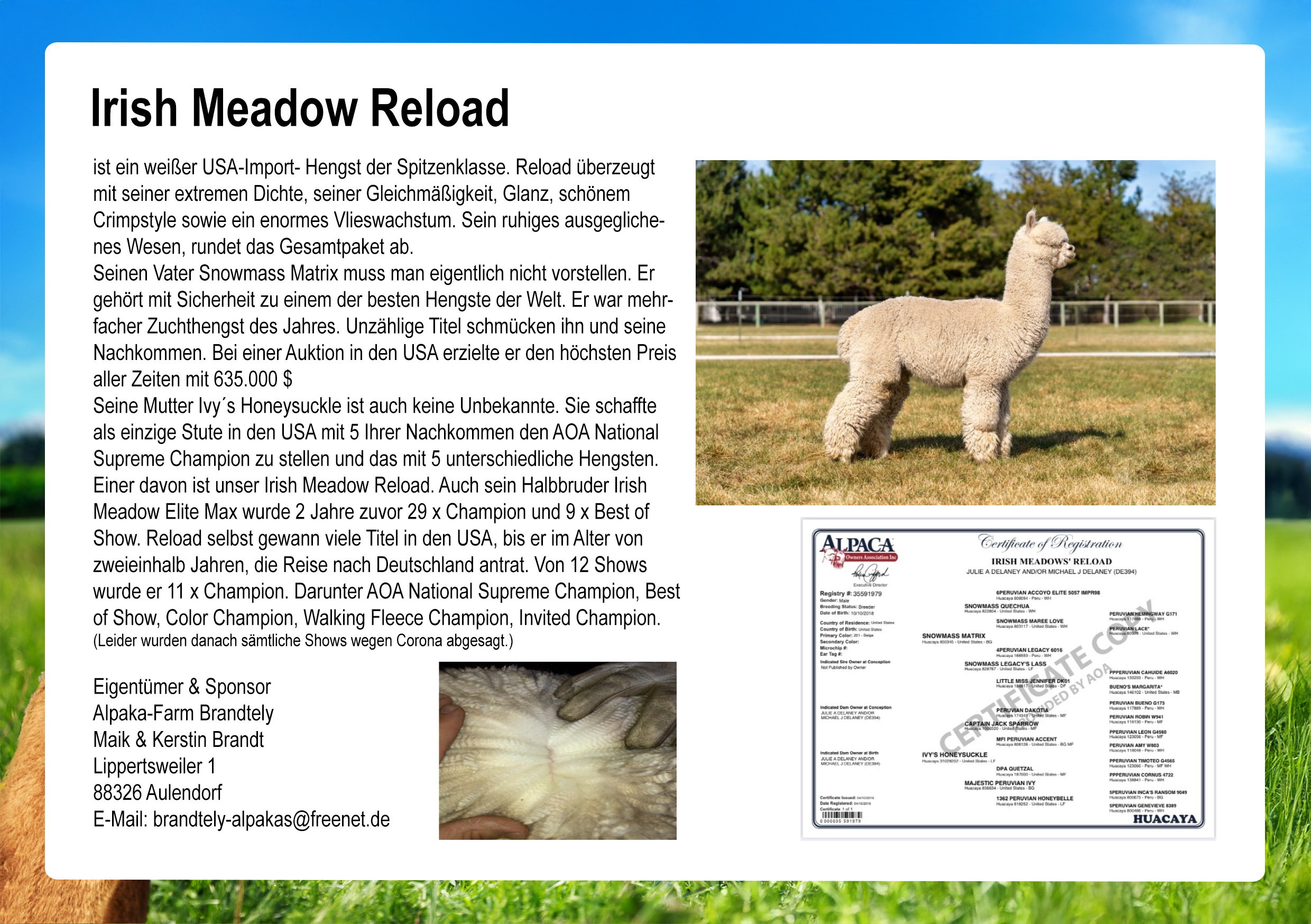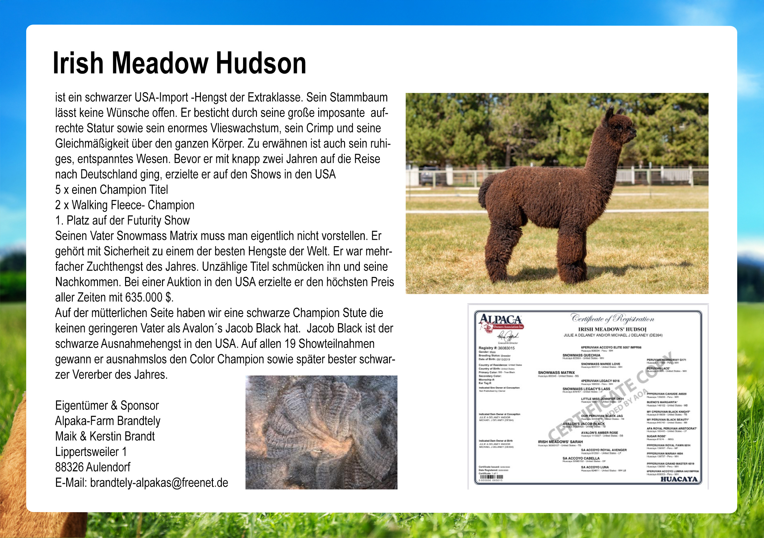 | Irish Meadow Hudson | Alpaka-Farm Brandtely | Info |